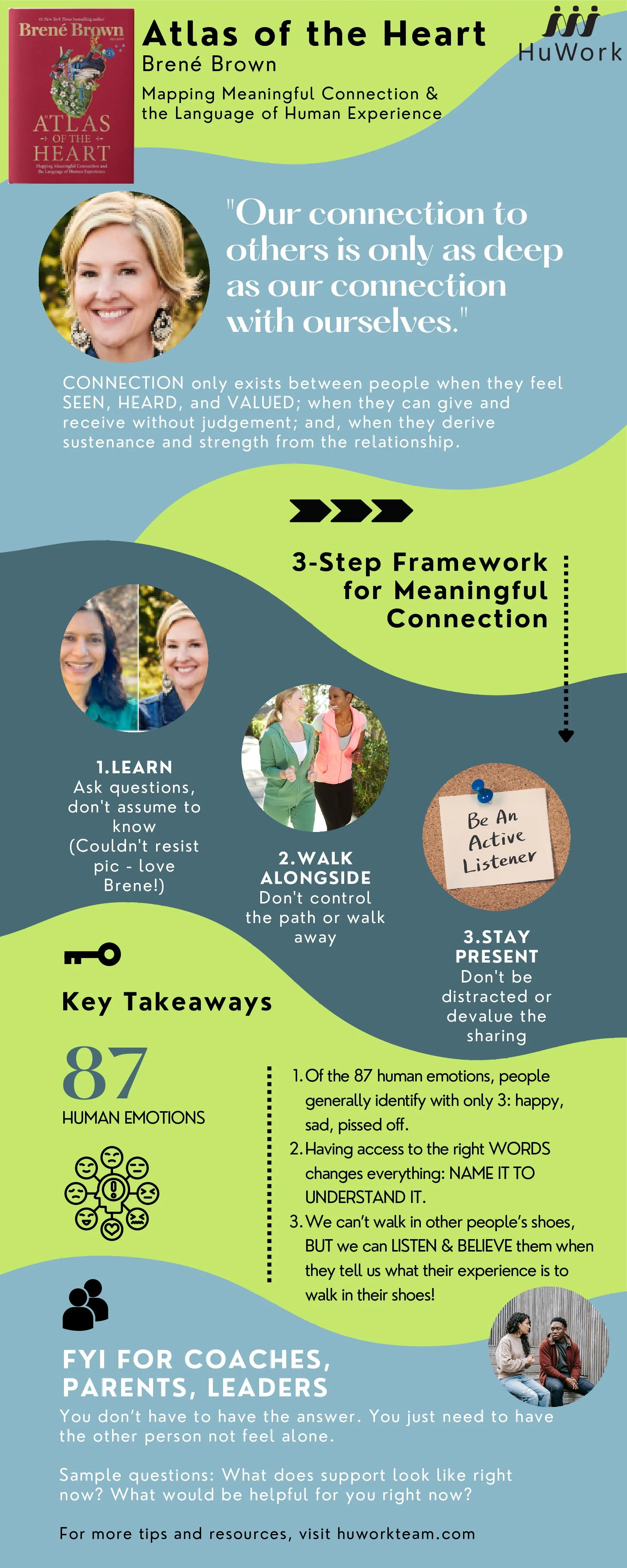 It is really dense, covering 87 human emotions as well as a framework for connecting with people in your world. Instead of a typical book review, I’m testing out an infographic style summary. Let me know if you like this format! (Plus, I couldn’t resist mocking up a photo of Brené and I side by side, which you’ll see on the infographic.)